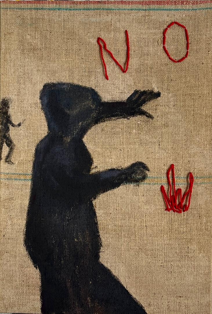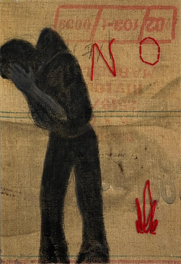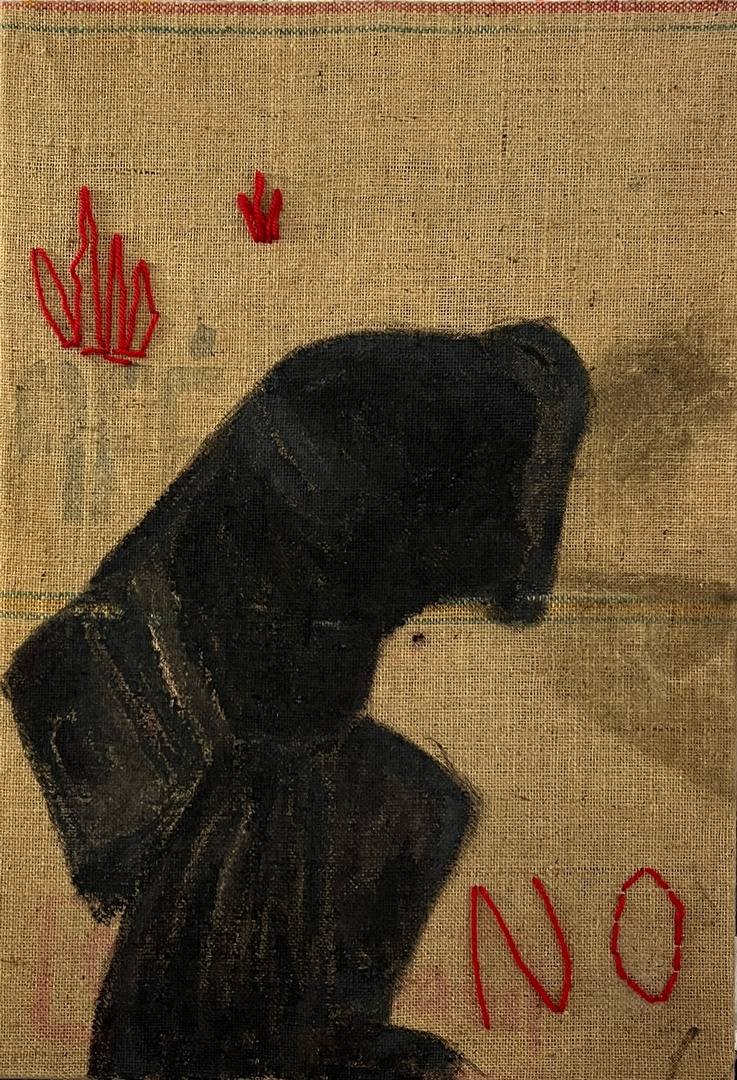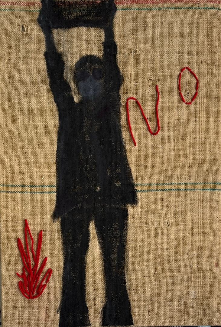 NO #1 (2024), Mixed Media Tempera und Stickerei auf Sackleinen
