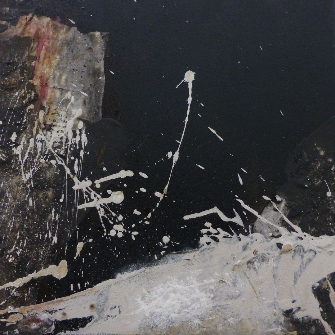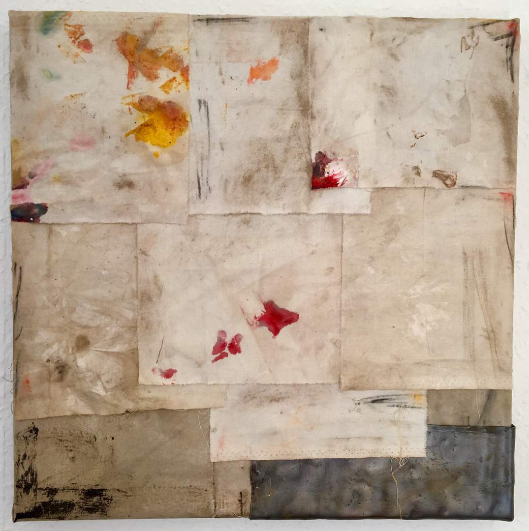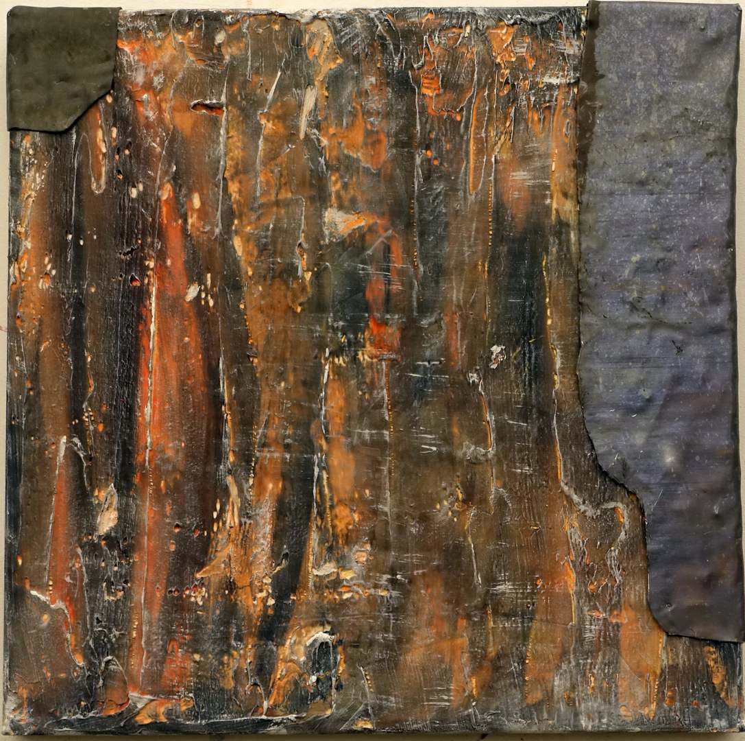 Wider die Schönfärberei #2 (Erinnerungen an Kurt E.) (2018), 50 x 50, Mixed Media auf Leinwand (Stoffausrisse mit Farbresten, Asche, Bitumen, Blei)
