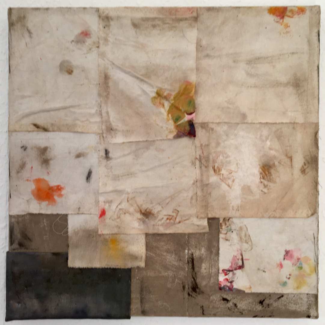 Wider die Schönfärberei #1 (Erinnerungen an Kurt E.) (2018), 50 x 50, Mixed Media auf Leinwand (Stoffausrisse mit Farbresten, Asche, Bitumen, Blei)