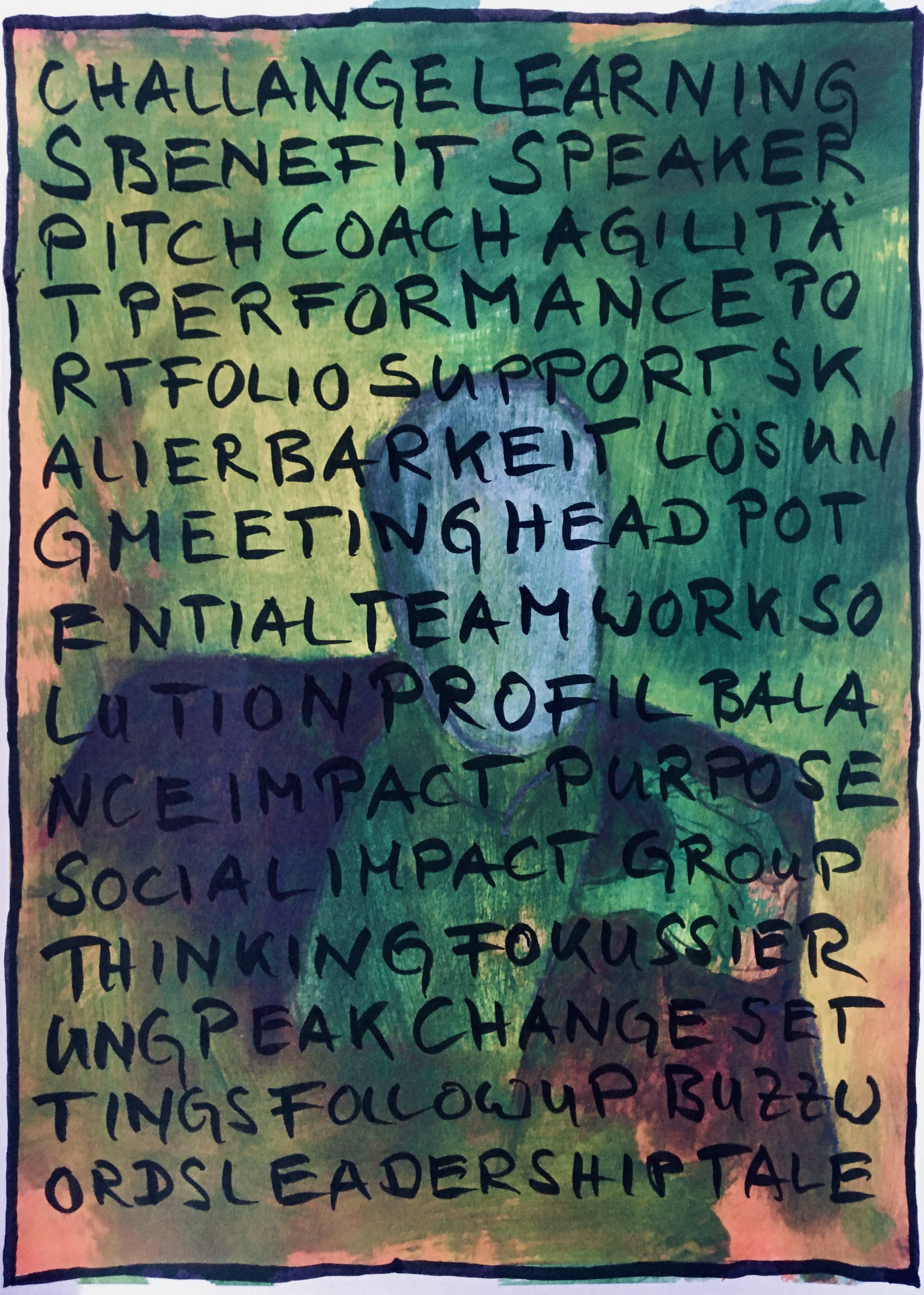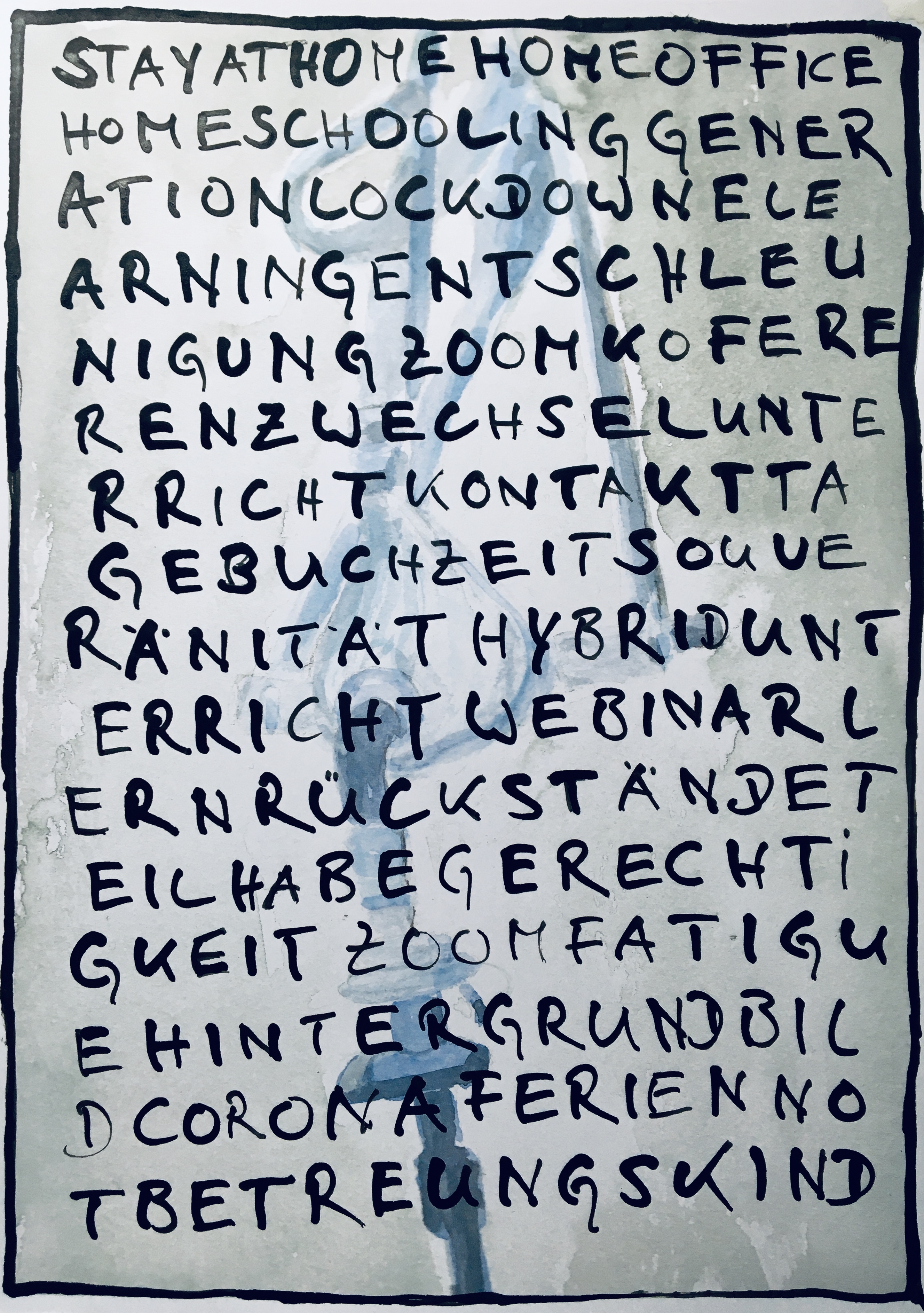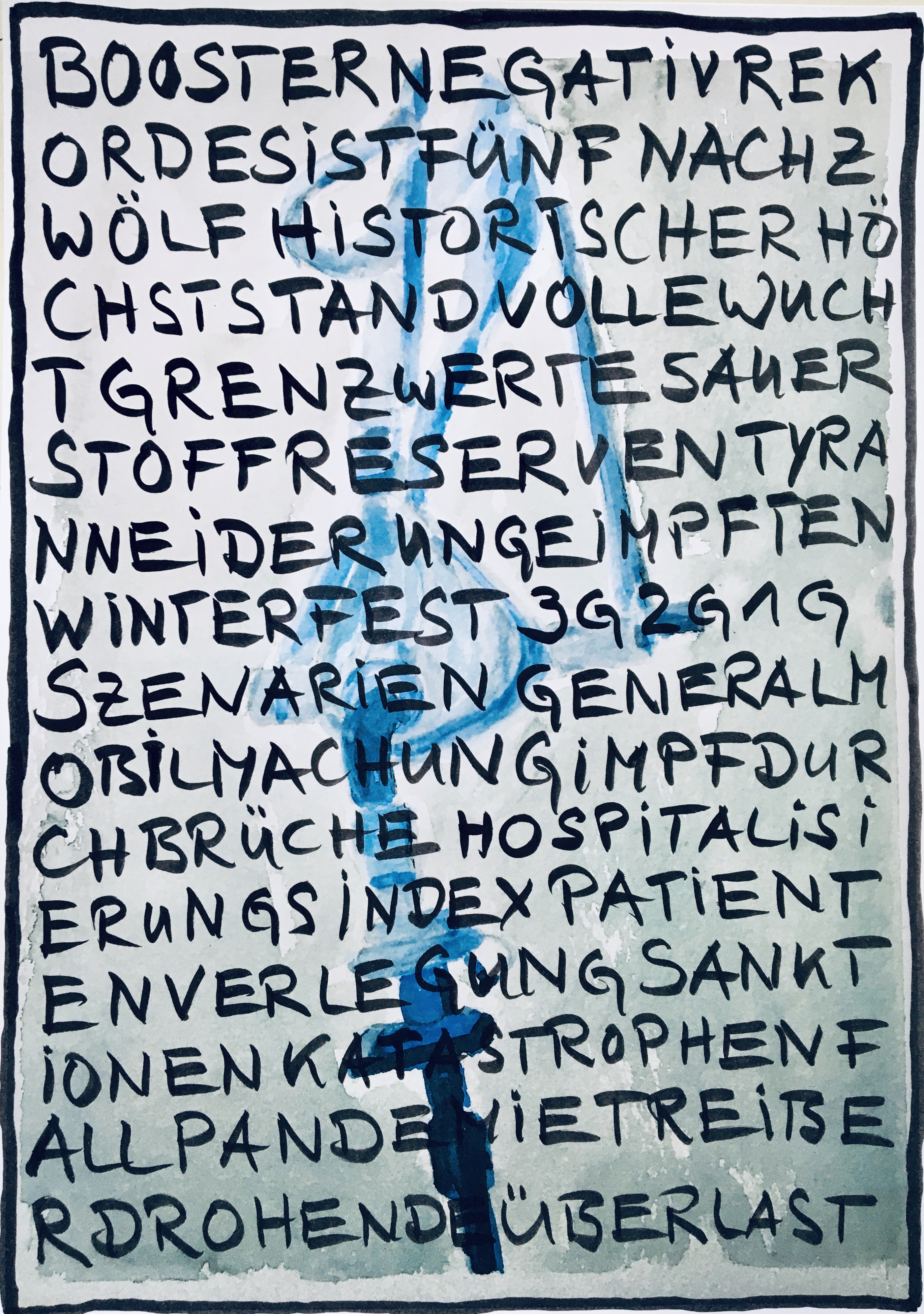 Booster Coronawords #6 (2021) 30 x 20, Tusche auf Druck